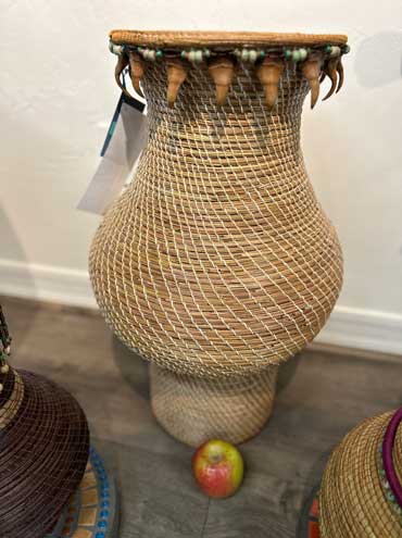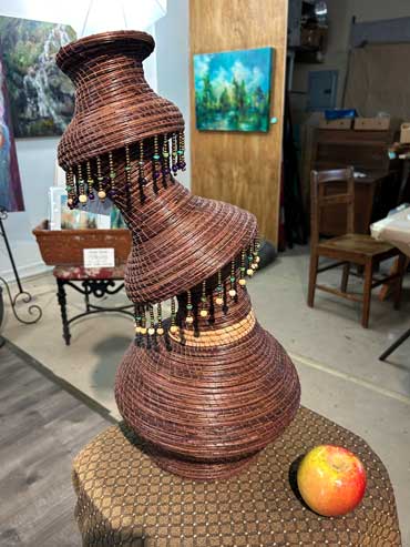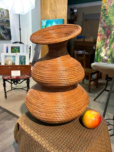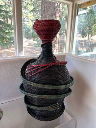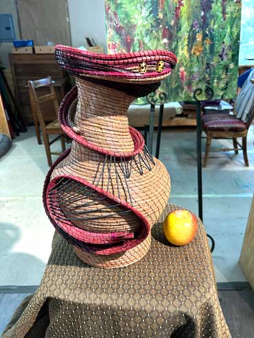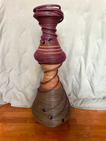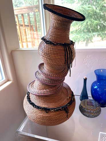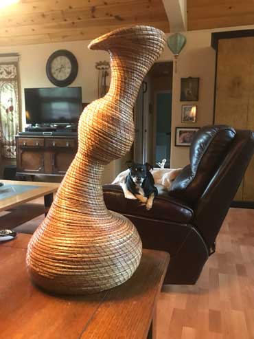 Prior to 2019 I began experimenting with making very tall pine needle vases or sculptures, then trying asymmetrical and whimsical shapes, which proved to be extremely challenging since pine needles have some recalcitrant characteristics.