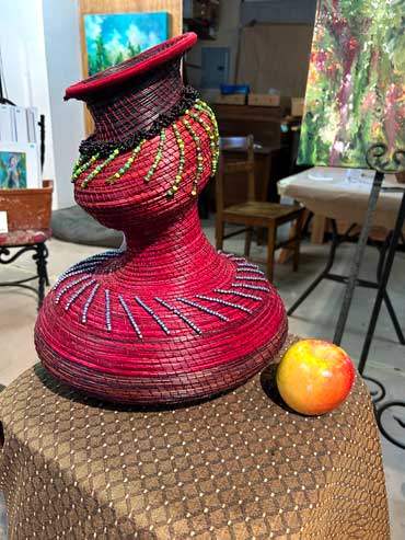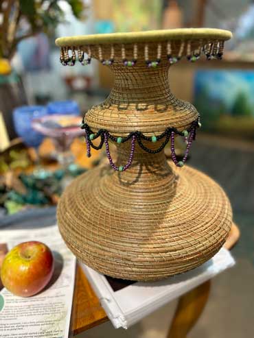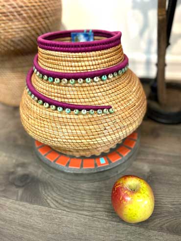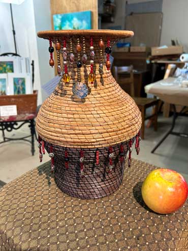 Pine needle vase/sculpture (Ponderosa) embellished with dyed red pine needle coils and beads.