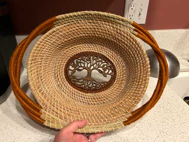 Natural pine needle basket (Ponderosa), metal tree of Life trivet incorporated in the middle, wrapped with natural fiber.