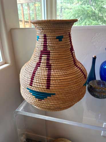 Natural pine needle basket (Ponderosa) embellished with wrapped pine needle coils and stones.