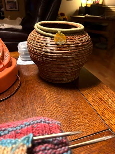 Natural pine needle basket/vase (Ponderosa) sewn with repurposed string died with coffee, embellished with repurposed beads, stones and Coulter pine cone scales.