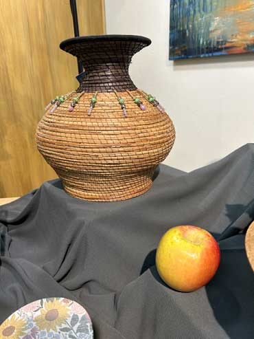 Pine needle vase (Ponderosa) semi-asymmetrical, embellished with beads, wrapped coiled pine needles and repurposed stone.